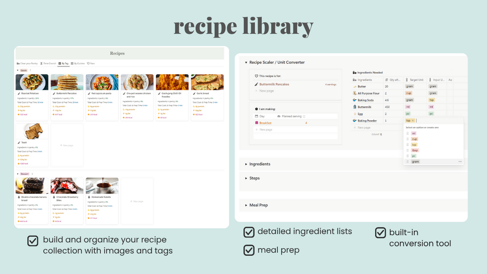 - Recipe Library: Build a collection of your favorite recipes, complete with categories, tags, detailed ingredient breakdowns and meal prep.